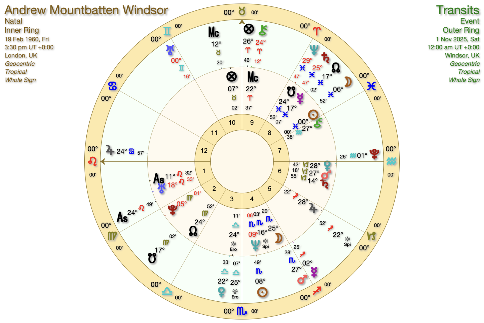 Andrew was born on 19 February 1960, at 3:30pm in London, United Kingdom (please see chart below with transits commencing 1 November 2025). Andrew’s ‘big 3’ is a combination of the Watery realm of feelings and emotions, with enthusiastic, inspirational Fire. He has an intuitive Pisces Sun and a deep, passionate, intense Scorpio Moon (in its Fall position), with regal Leo rising. The Ascendant or Rising sign is where the ancients saw the spirit meeting the body. With Leo rising there is a need to shine, and to be recognised and even applauded.