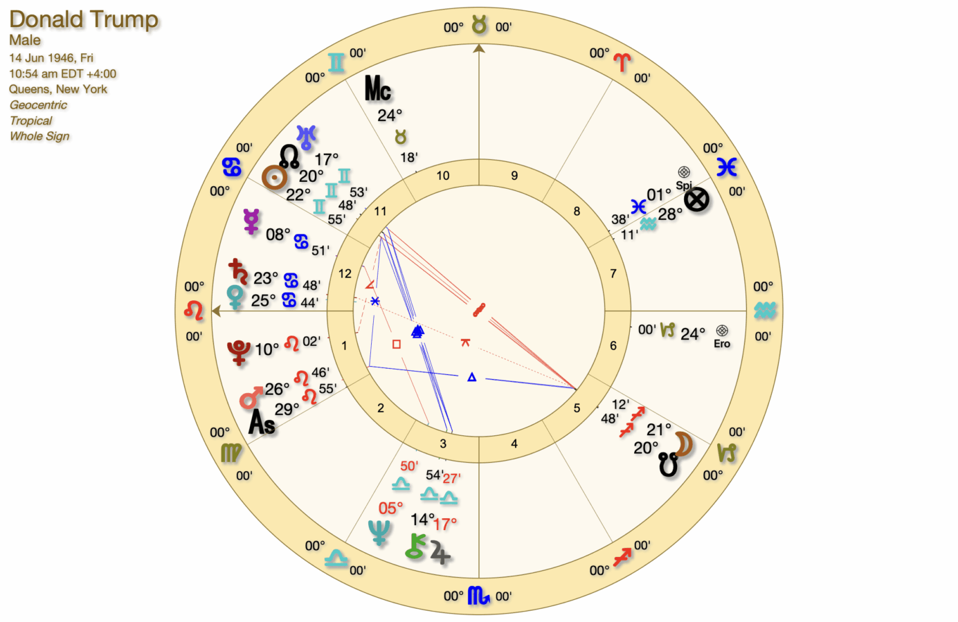 Trump’s Sun is in the Air sign of Gemini; a curious, chatty, communicative sign, which enjoys making connections with others and collecting data. Trump may be restless since Gemini is also a Mutable sign, indicating changeability, versatility and flexibility. His Sun is also closely aligned with the North Node in Gemini, denoting he was born at the time of an eclipse. Since his Sun opposes his Moon in the adventurous sign of Sagittarius, he was born at the time of a Lunar Eclipse. The eclipse is total given the proximity of the Nodal axis to the Sun and the Moon (within 9 degrees). The eclipse falls across the 11th (Sun)/5th (Moon) house axis, associated with friends, groups and alliances (11th) and children, sex, pleasure and creativity (5th). The Moon in Fiery, Mutable Sagittarius tends towards feelings of optimism and inspiration.