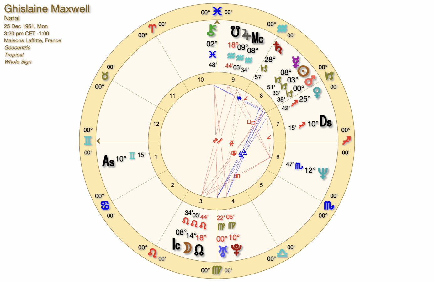 Ghislaine Maxwell was born on 25 December 1961 in Maisons-Laffitte, France at 3:20pm. She is a Capricorn Sun, Leo Moon and her Rising sign (or Ascendant) is Gemini (please see attached chart).