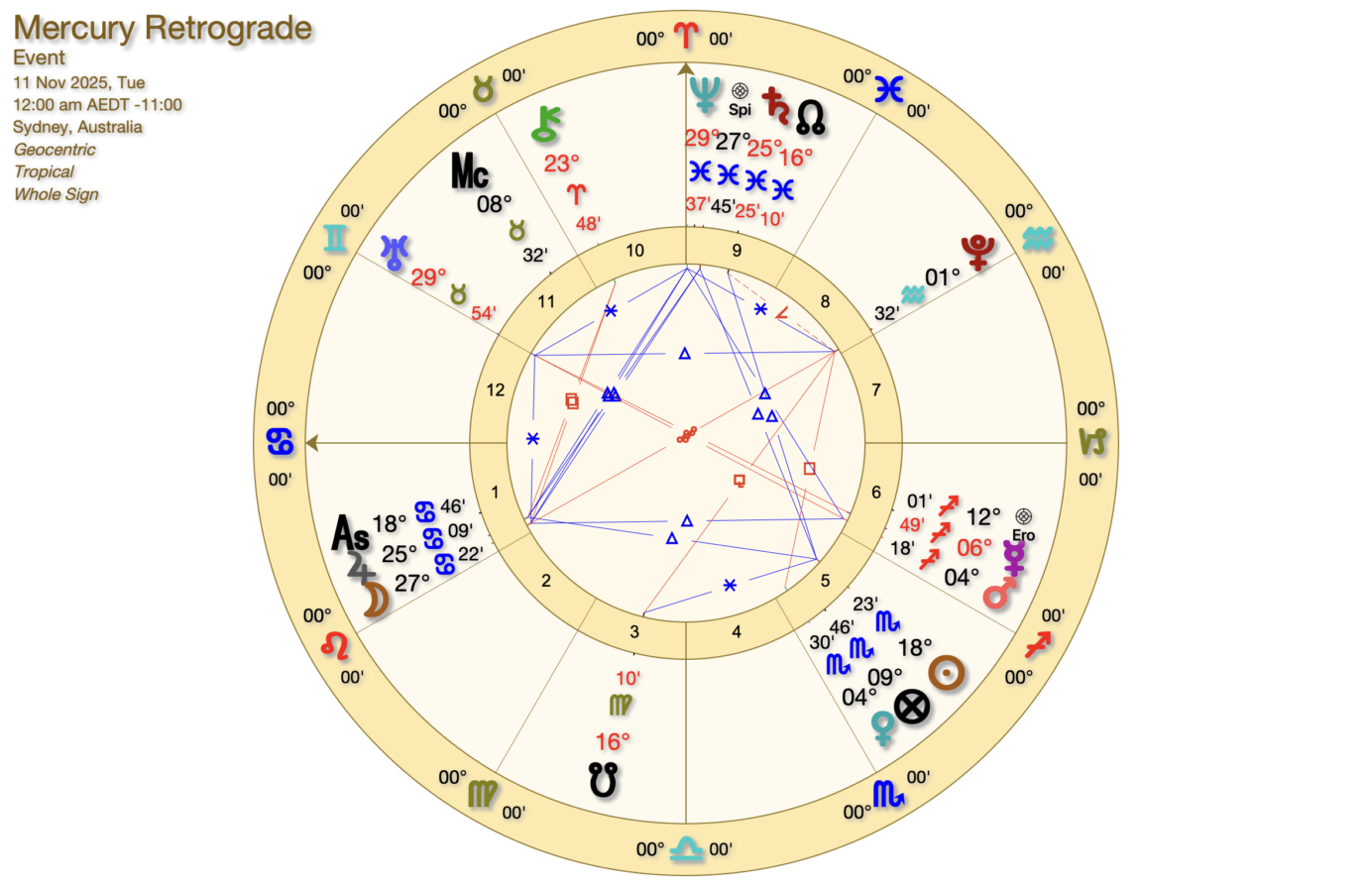 Messenger planet Mercury, representing information, the gathering of ideas and useful facts, questioning and debating, stations Retrograde on 9 November 2025 (depending where in the world you live) at 6 degrees of the visionary sign of Sagittarius, the sign of Mercury’s Exile. It will move back into the sign of Scorpio on 18 November 2025. It entered its ‘shadow period’ on 21 October 2025 at 20 degrees of Scorpio; the degree it will retrograde back to before going direct. This cycle occurs three times a year, for three weeks at a time. (See chart below, Sydney time/date).